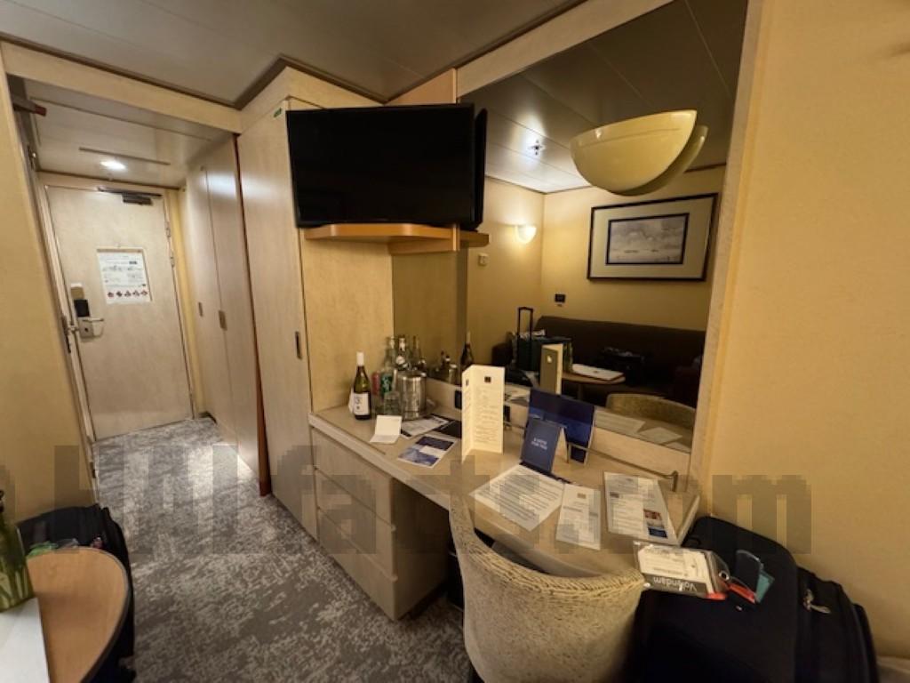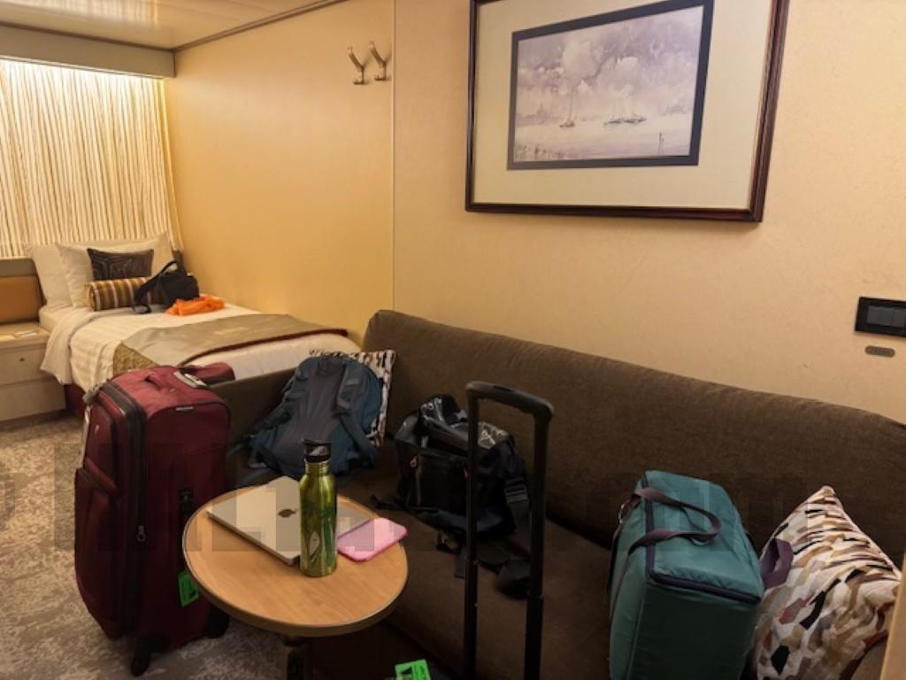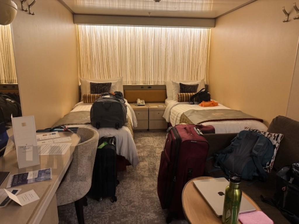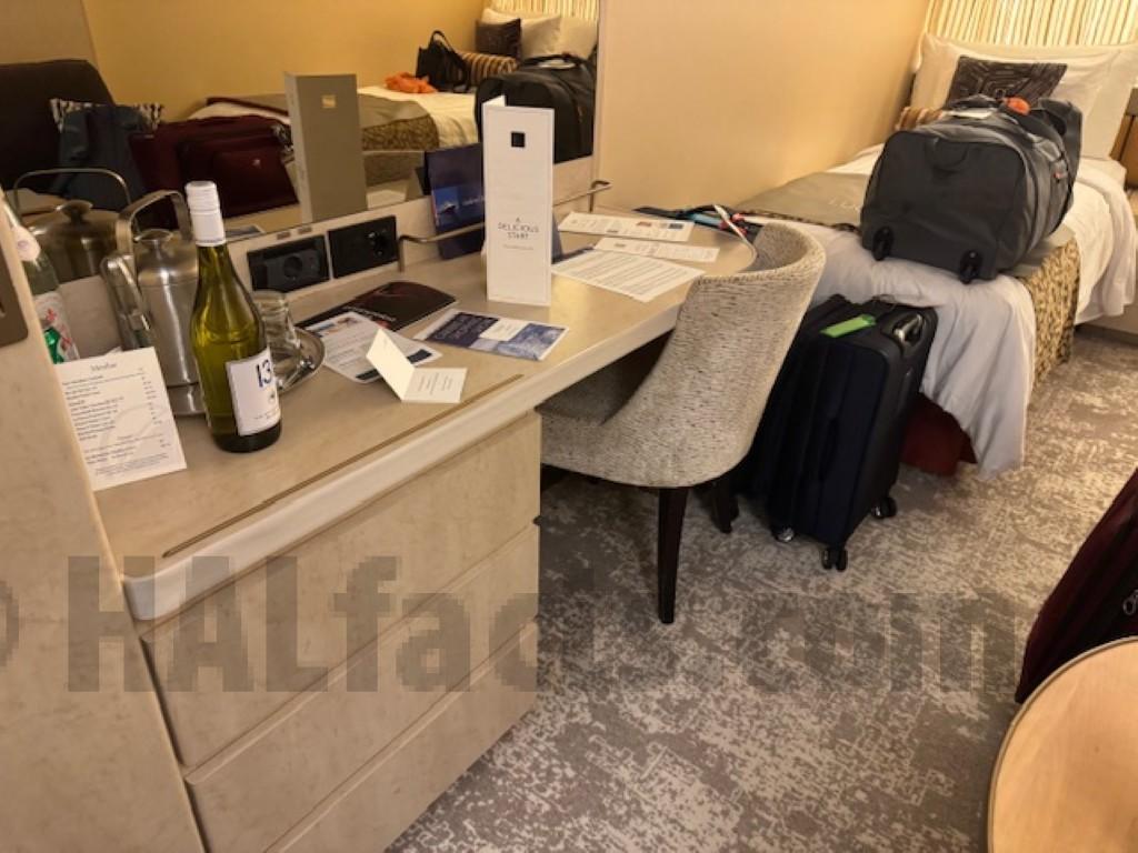Note: cooler was added under desk during this cruise. It might be able to be moved to between the desk and bed in order to allow sitting at the desk, but it might block access to the side of the bed when the beds are arranged as one bed.