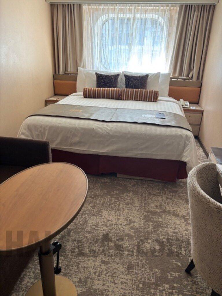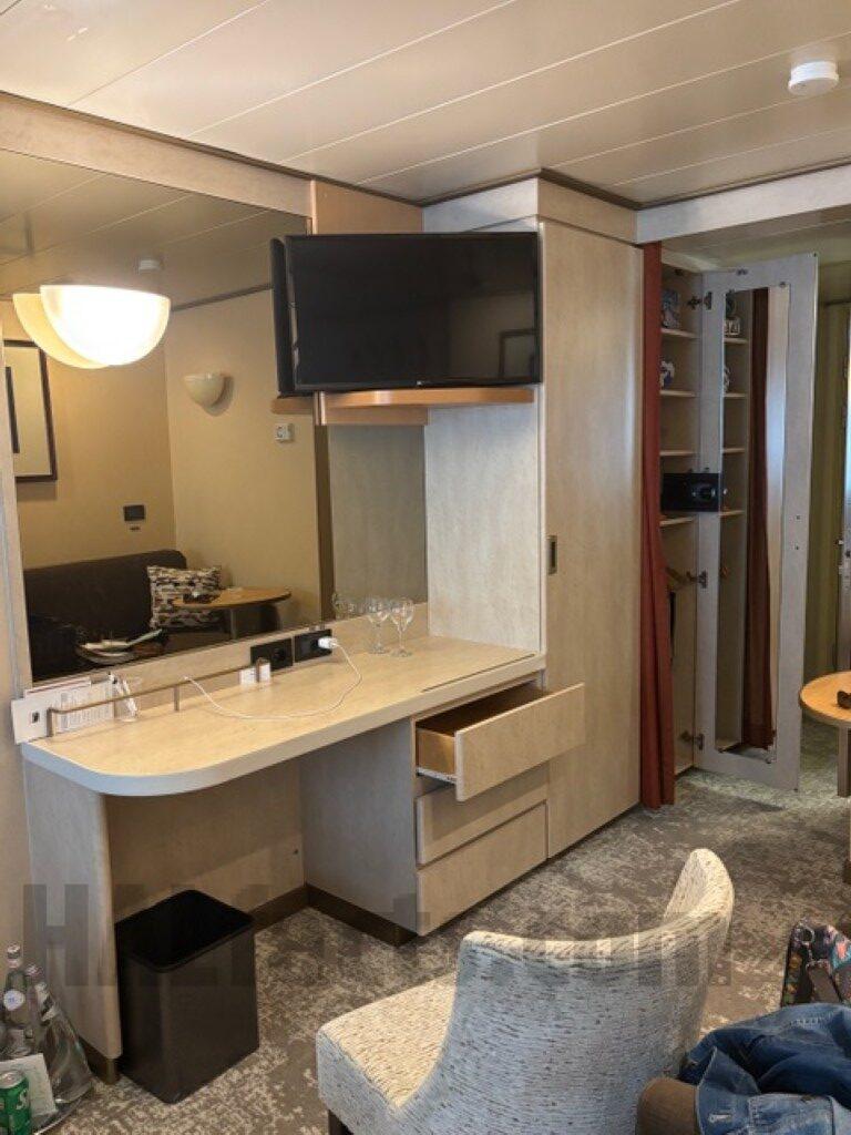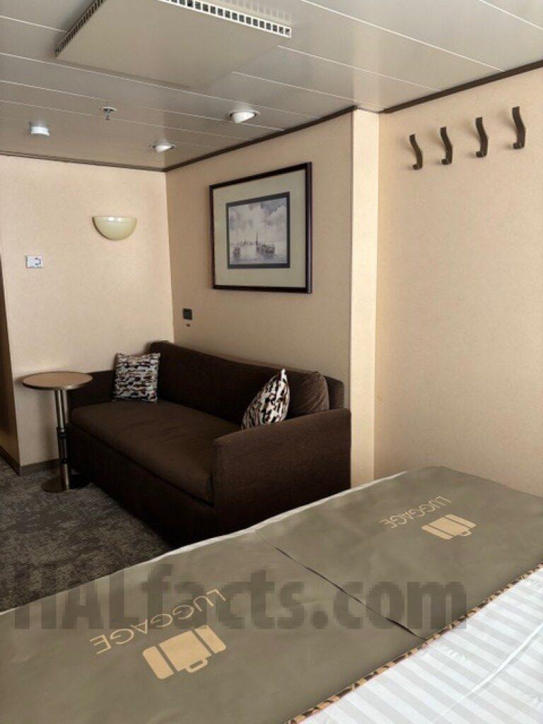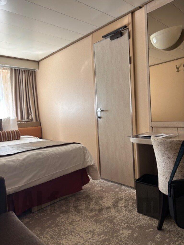 OV 2633 is Cat C, completely unobstructed Oceanview.  Mid-aft location was noise-free and room had no squeaks. Carpet was in new condition. The sofa is extra long (sleeps 2) meaning no table beside it.  Normal storage closets plus lots of space in window for storage if nec. Lighting was on the dim side, but not a real bother. No refrigerator as normal on Deck 2, but if rented, one could be put on the writing desk, which is also extra long. Phone could be moved behind headboard to free up bedtable space. Heard no noise through connecting door, but couldn’t hear announcements except the Captain. Very pleased with this location and quality of room.  This is the oldest ship in the fleet as of this writing.