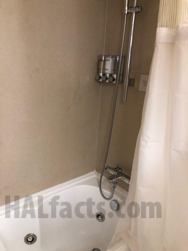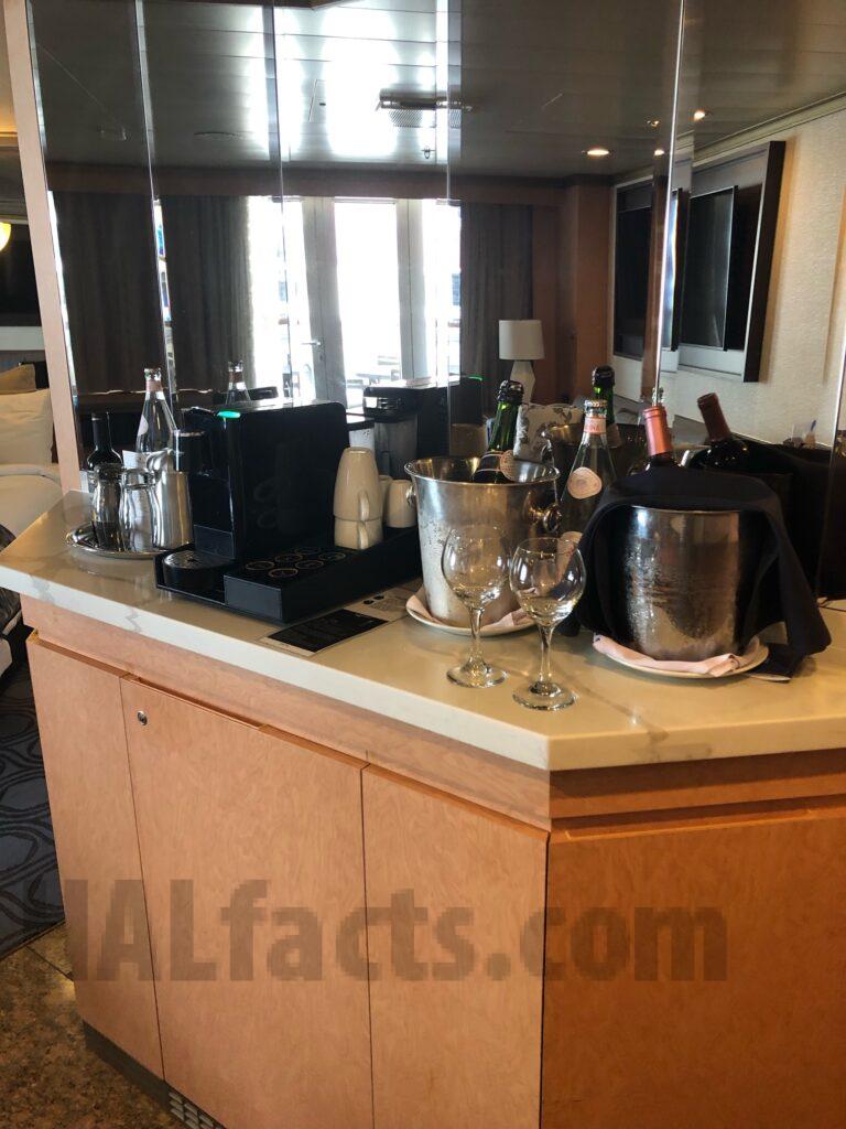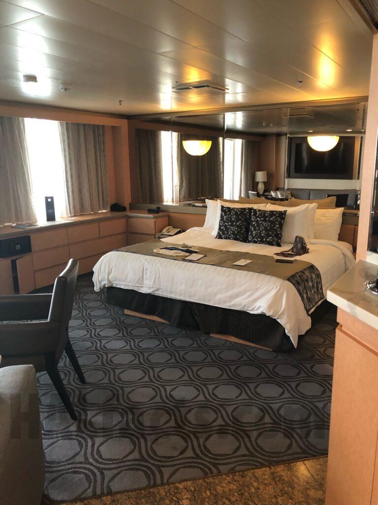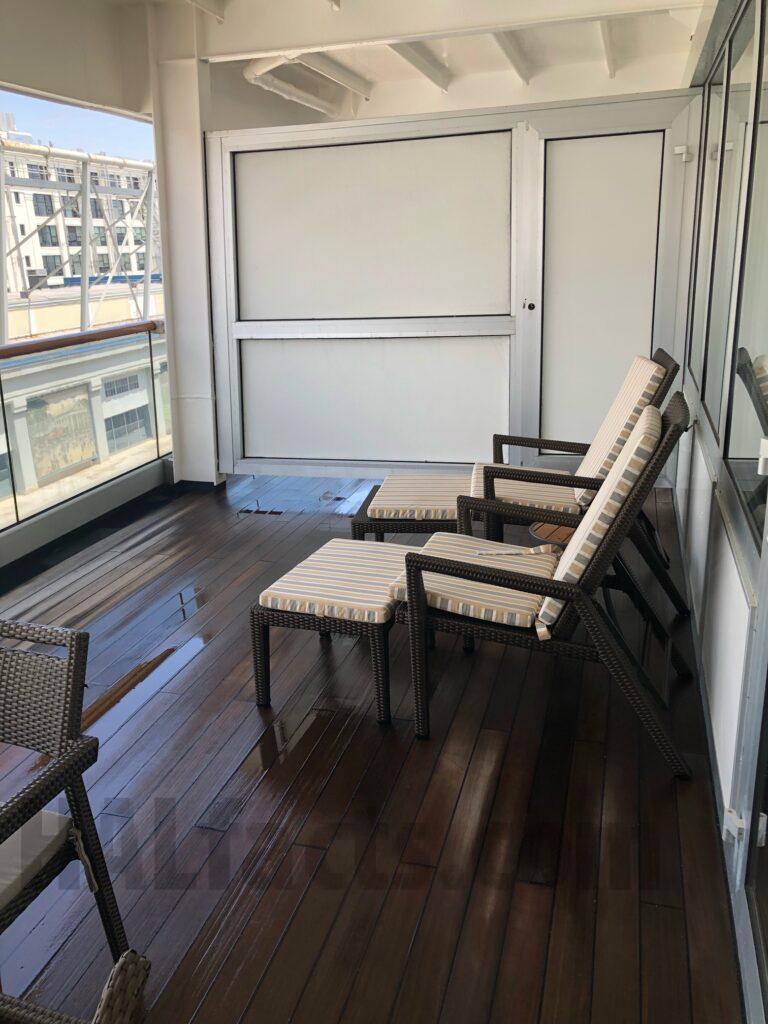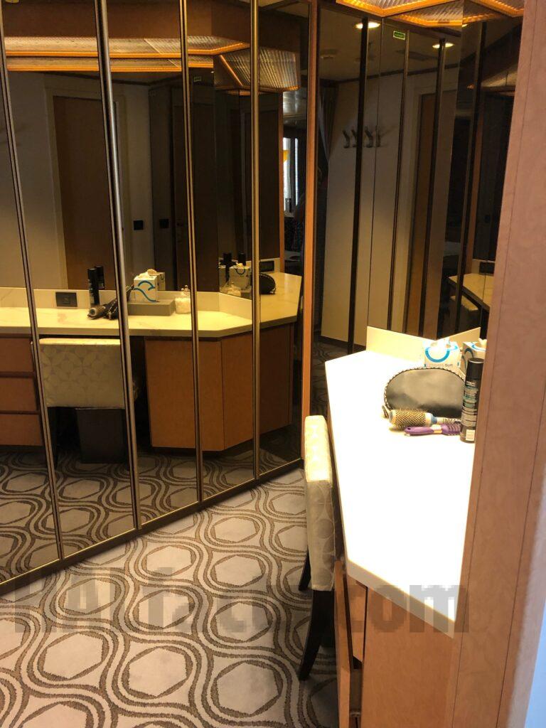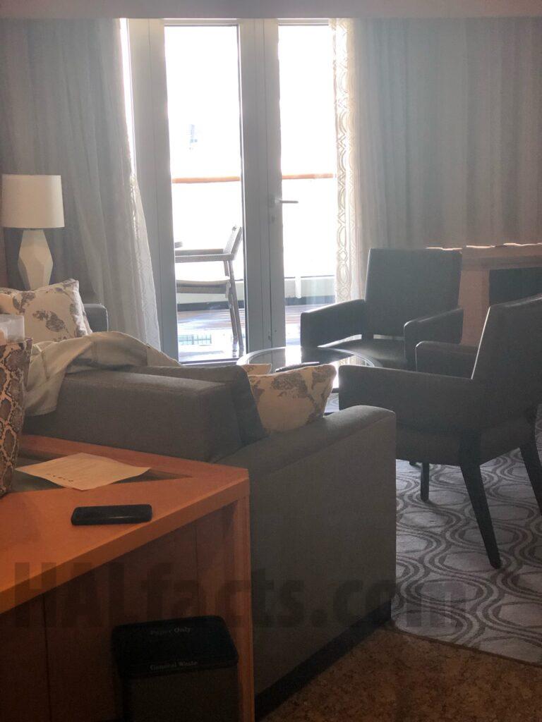 These are pictures of our Neptune Suite 7021 on the Zaandam from cruise we took June 2023. The room is located almost directly across from the Neptune Lounge. It is a quiet area, close proximity to elevators as well. There are USB ports behind the bed on the wall, in one lamp, and also two in the makeup/changing room. It has a shower/jetted tub combination, no separate shower and one sink. The sofa also pulls out to a bed. The veranda is very large because it seemed as though it was deeper than any of the other ships. There is a very large flat screen TV mounted on the wall over the sofa.