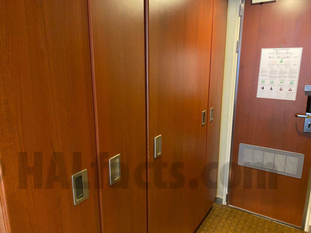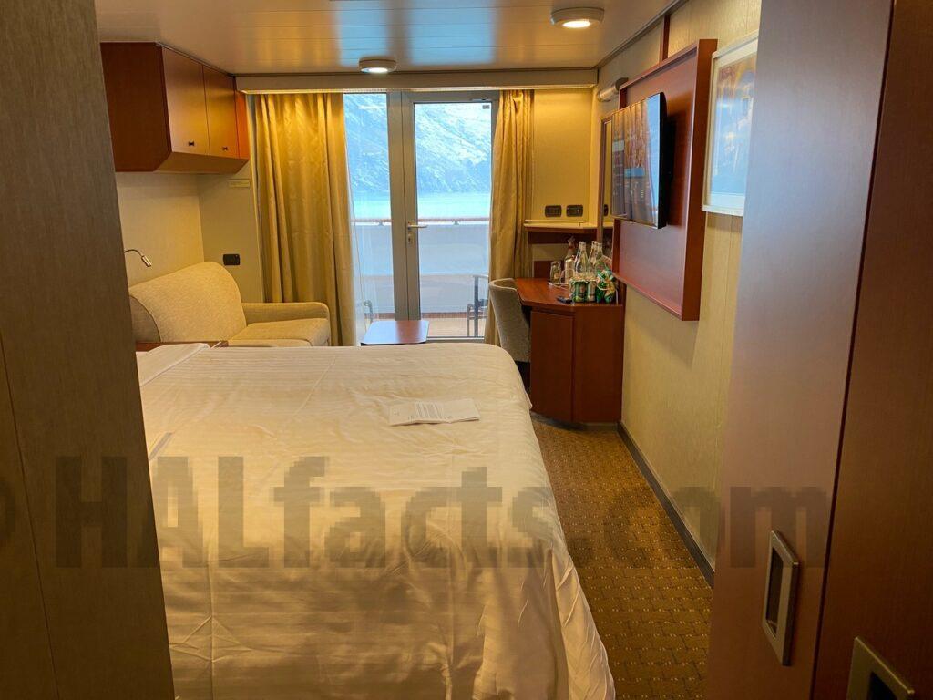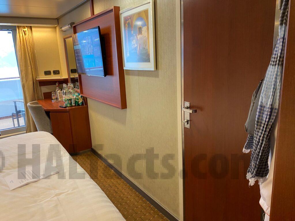 Veranda stateroom 4025 was my ….. isolation room on Nieuw Amsterdam in September 2022.  It is a connecting room, but I did not hear anything from my neighbours.  I could hear and feel the thump of music in the MainStage below when there was  a loud show.  All in all, quite a quiet room.  It could use an update, though, the carpet is old, but the sofa looked recently reupholstered.  Nice big TV.