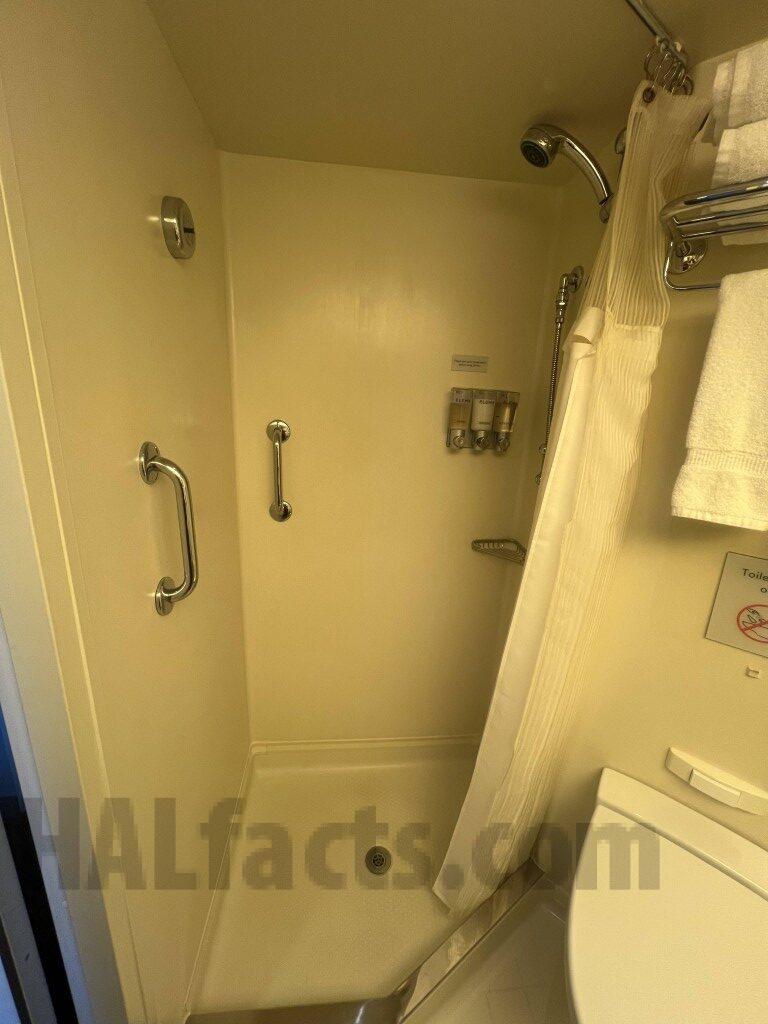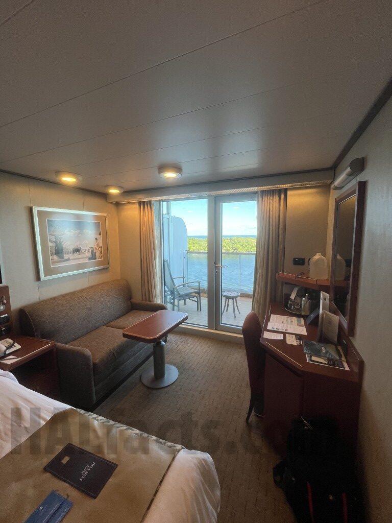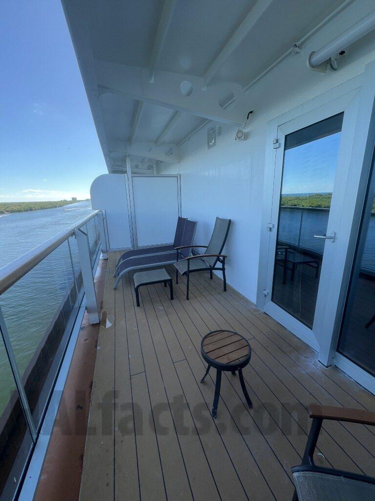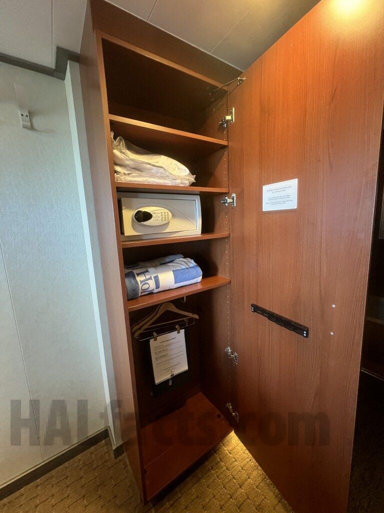 “Note – this cabin has a double wide balcony (as does 4166). This cabin has a shower only. The counter is longer than in 4166 (and presumably other VD cabins with showers). The shower area is smaller than the rooms with tub. The last pictures shows that the bathroom door opens to the main part of the cabin. The closet with the shelves & safe was at the end (nearest the cabin door). The two closets closer to the main part of the cabin could be used for hanging items or shelves (or both). The balcony for this cabin is double wide. It is the mirror image of that for VD4166.”