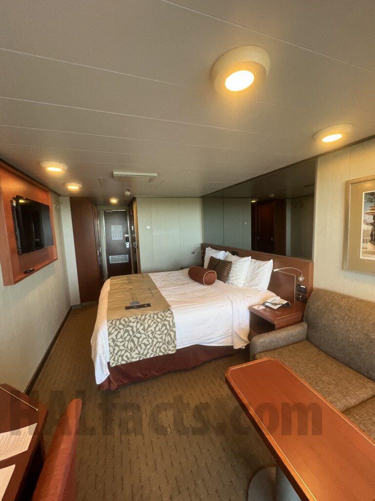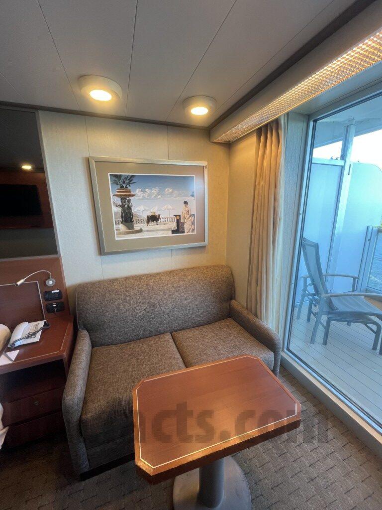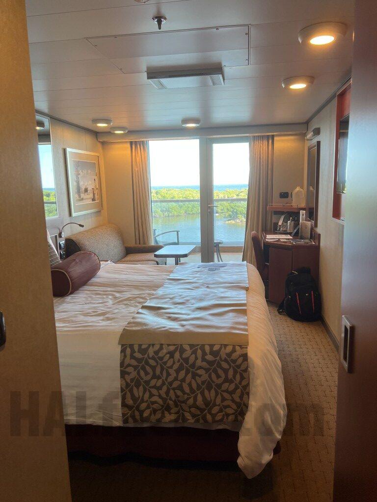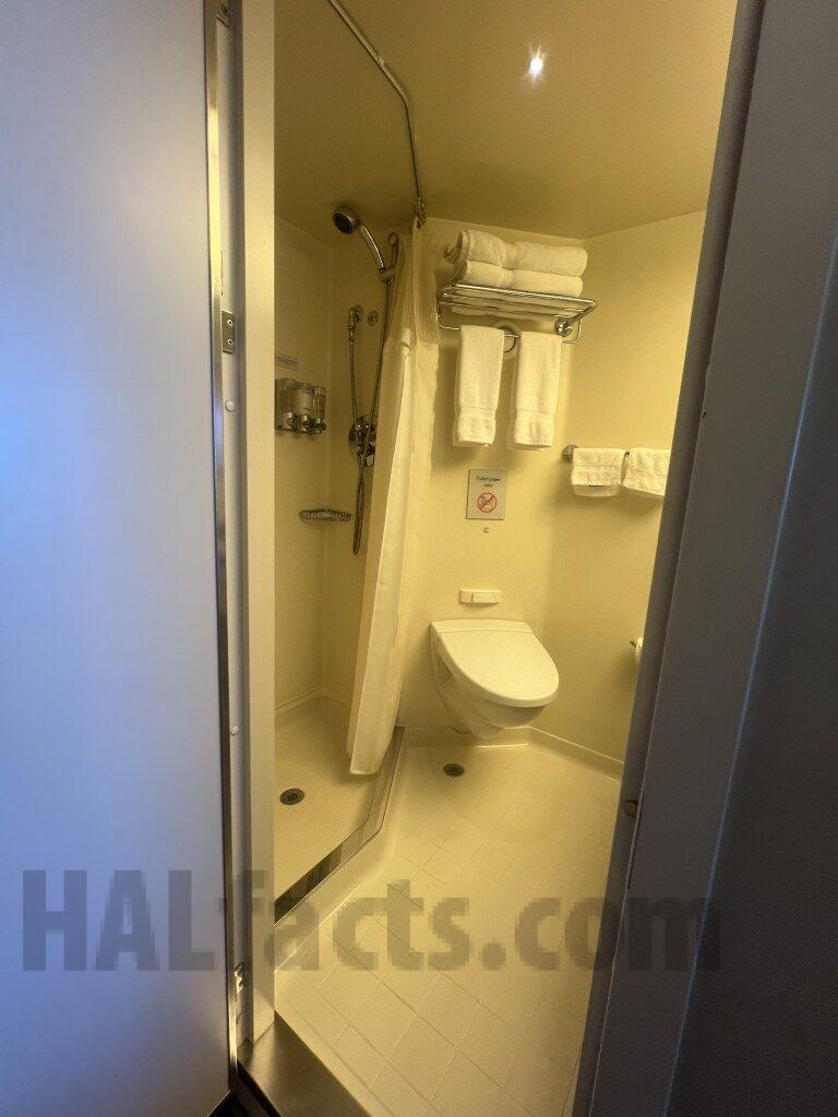 “Note – this cabin has a double wide balcony (as does 4166). This cabin has a shower only. The counter is longer than in 4166 (and presumably other VD cabins with showers). The shower area is smaller than the rooms with tub. The last pictures shows that the bathroom door opens to the main part of the cabin. The closet with the shelves & safe was at the end (nearest the cabin door). The two closets closer to the main part of the cabin could be used for hanging items or shelves (or both). The balcony for this cabin is double wide. It is the mirror image of that for VD4166.”