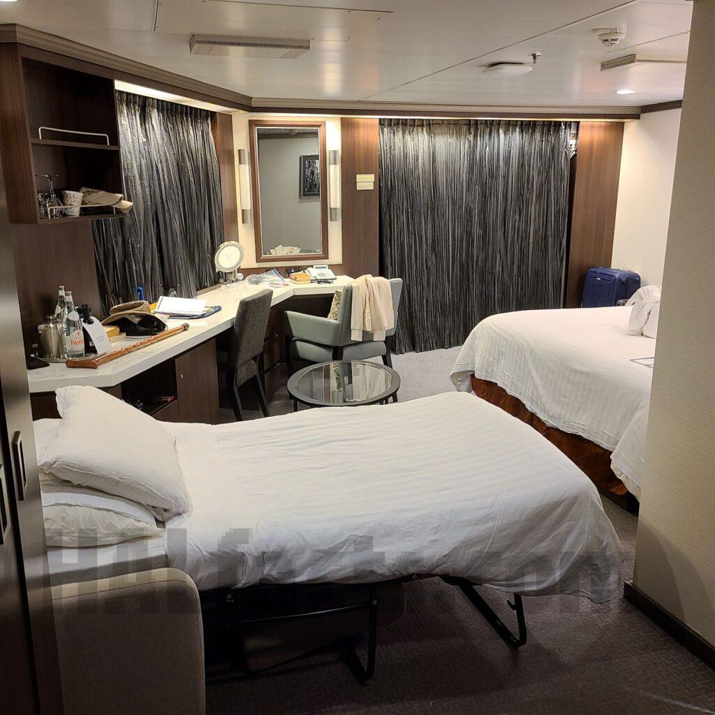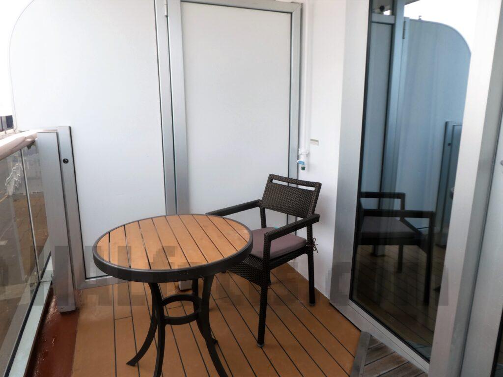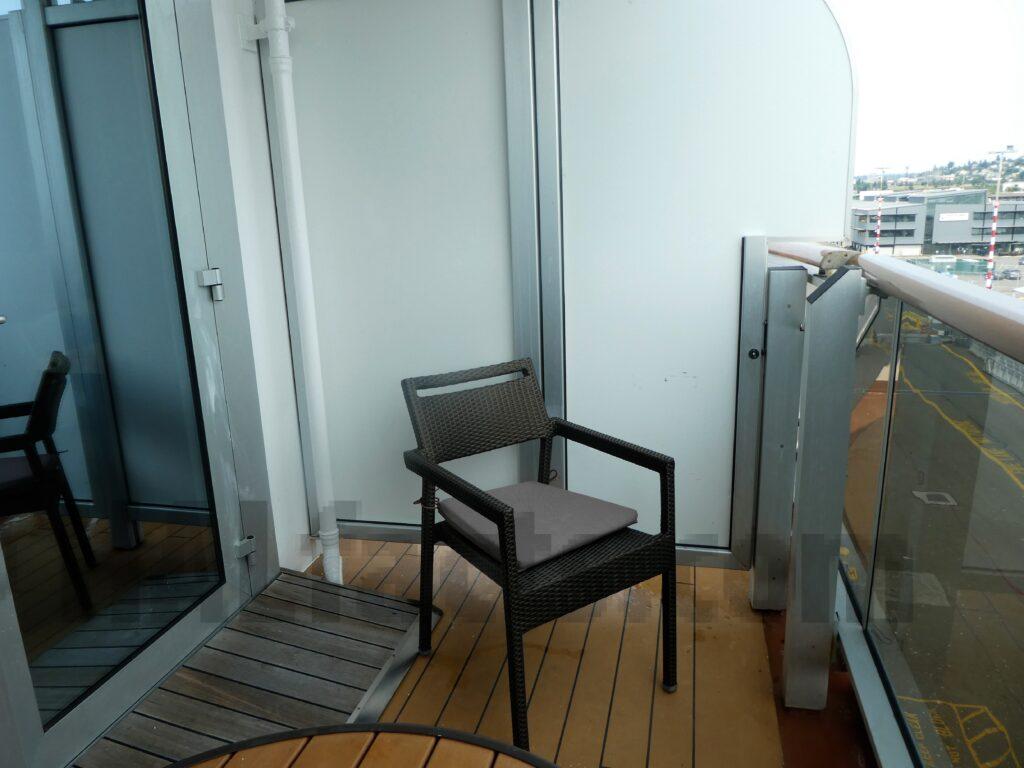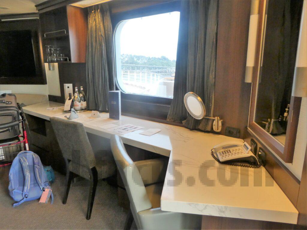 The cabin is well laid out. You walk in and the bathroom is on your right. Closets are on the left then a shorter couch. Next is the long desk area and a view out the porthole. The deck is somewhat small. The bathroom is spacious and had great pressure in the shower.
