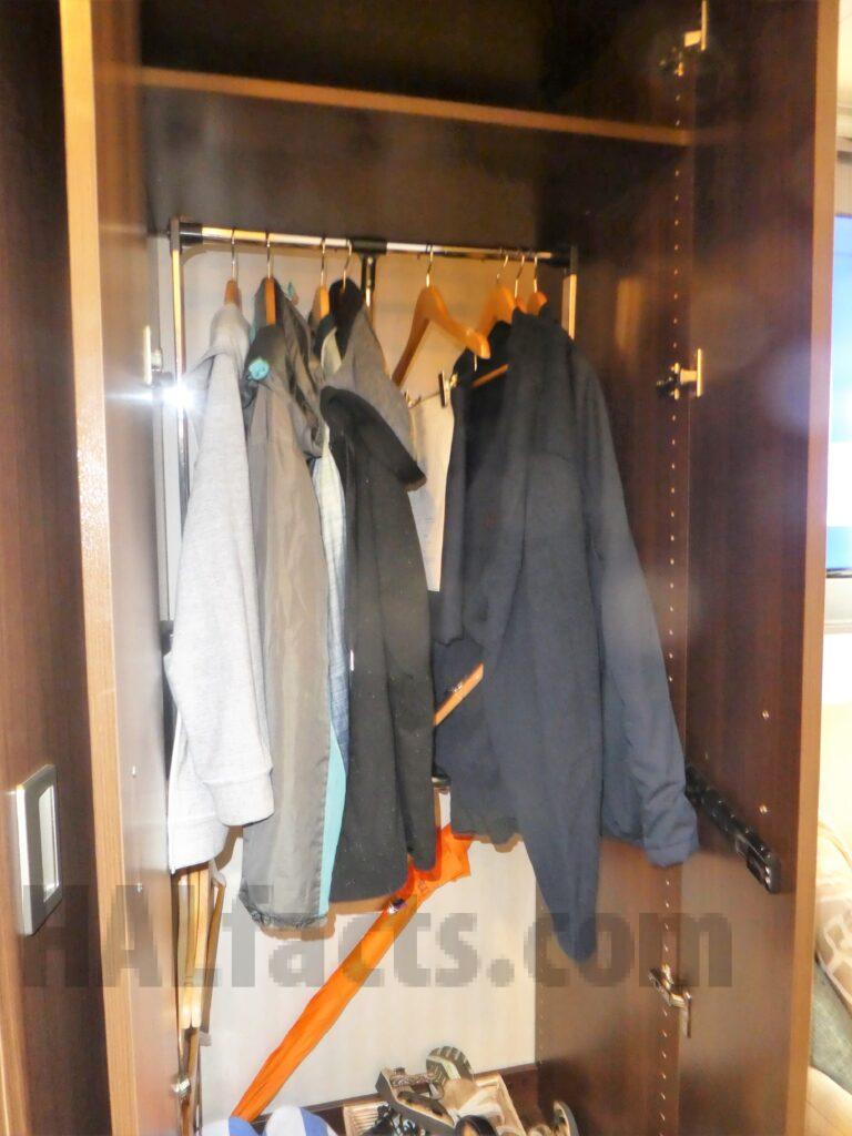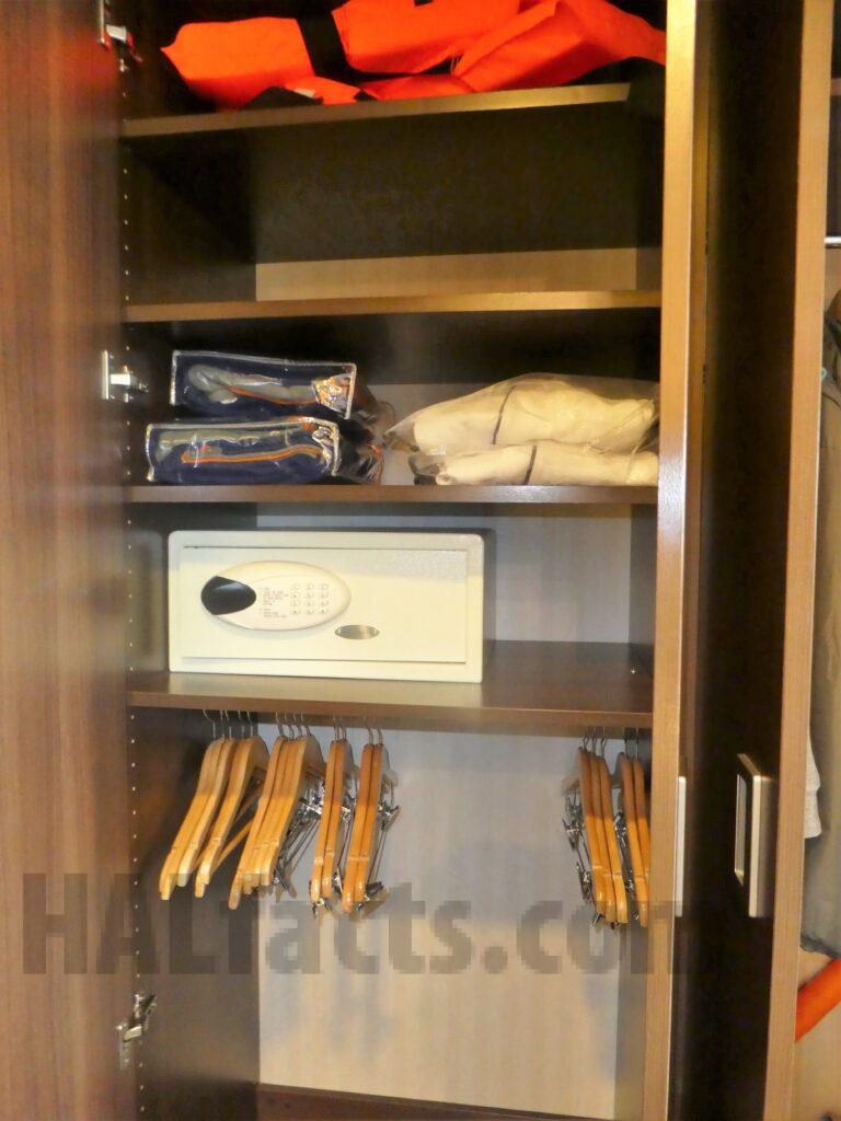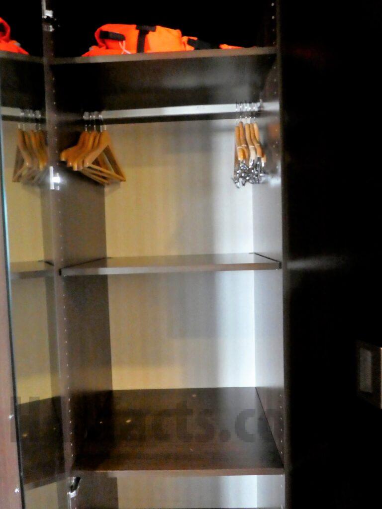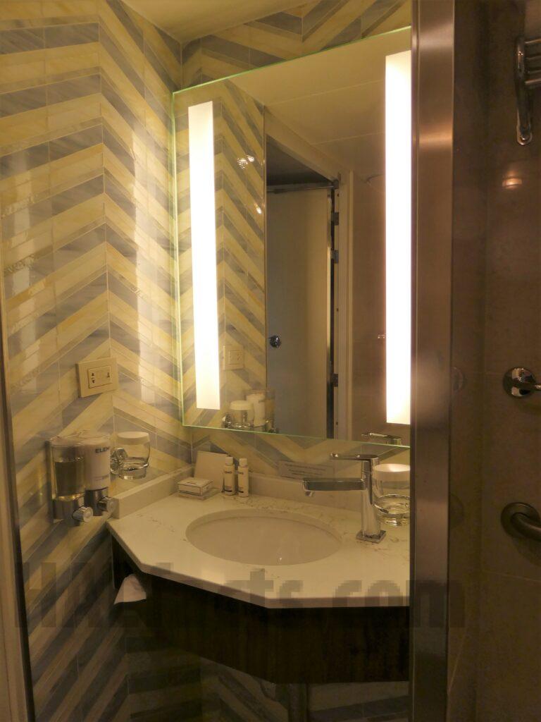The cabin is well laid out. You walk in and the bathroom is on your right. Closets are on the left then a shorter couch. Next is the long desk area and a view out the porthole. The deck is somewhat small. The bathroom is spacious and had great pressure in the shower.